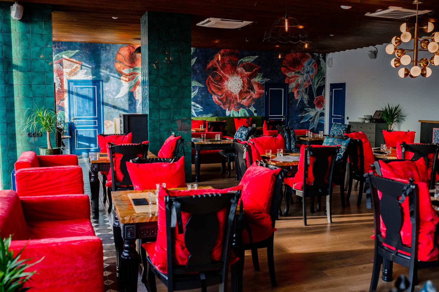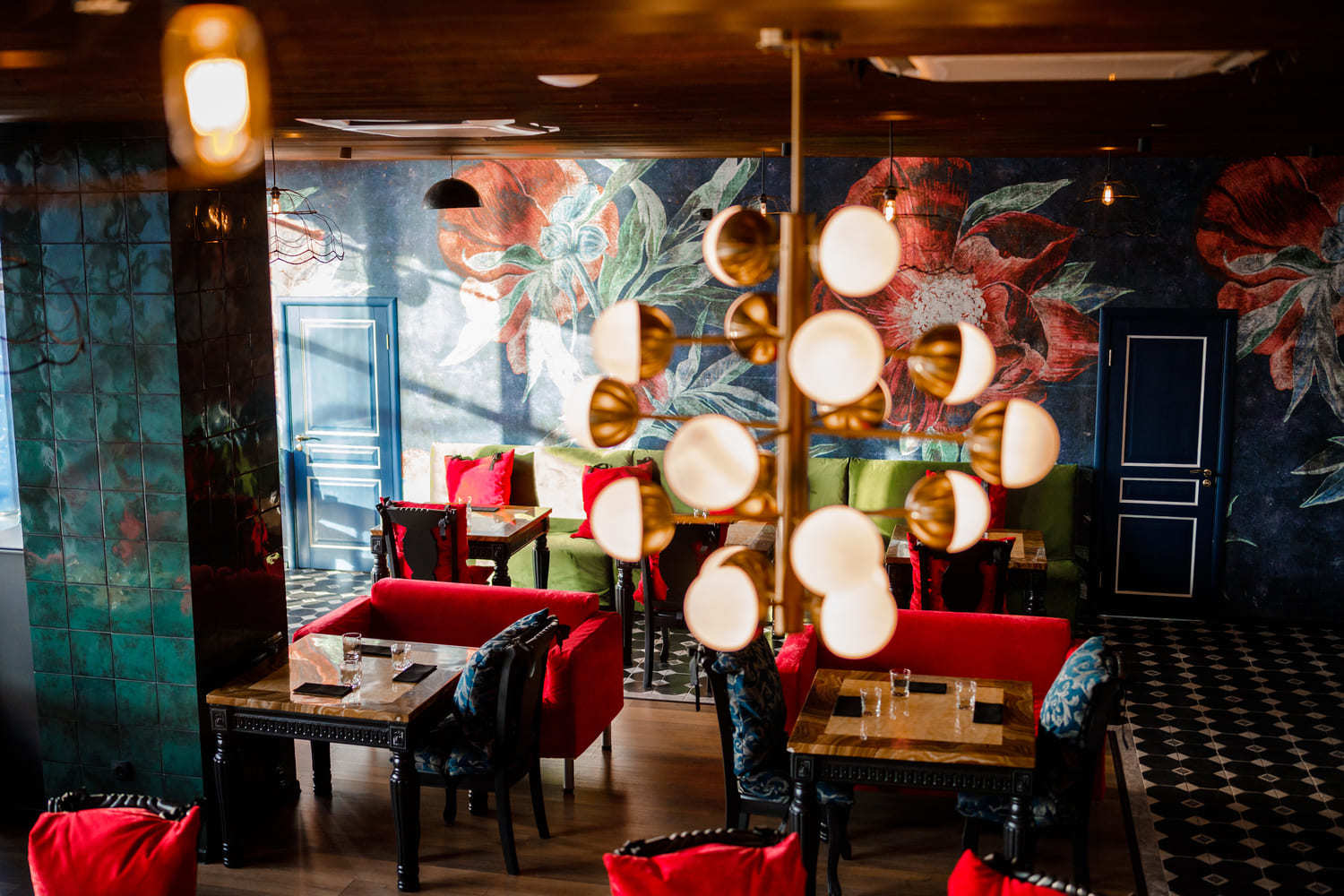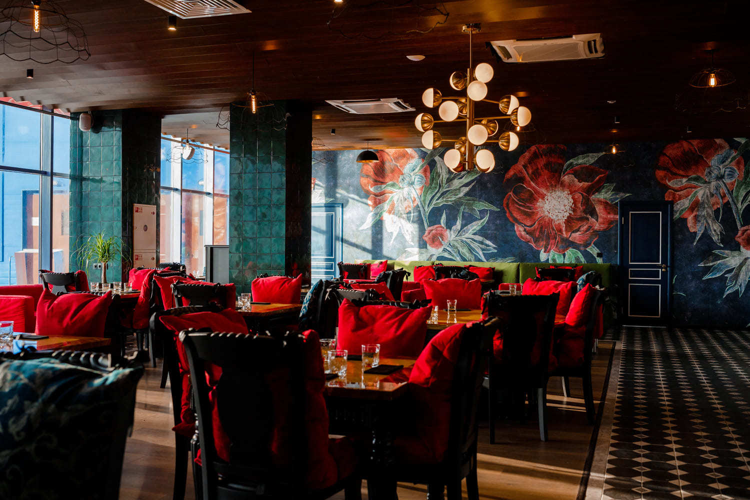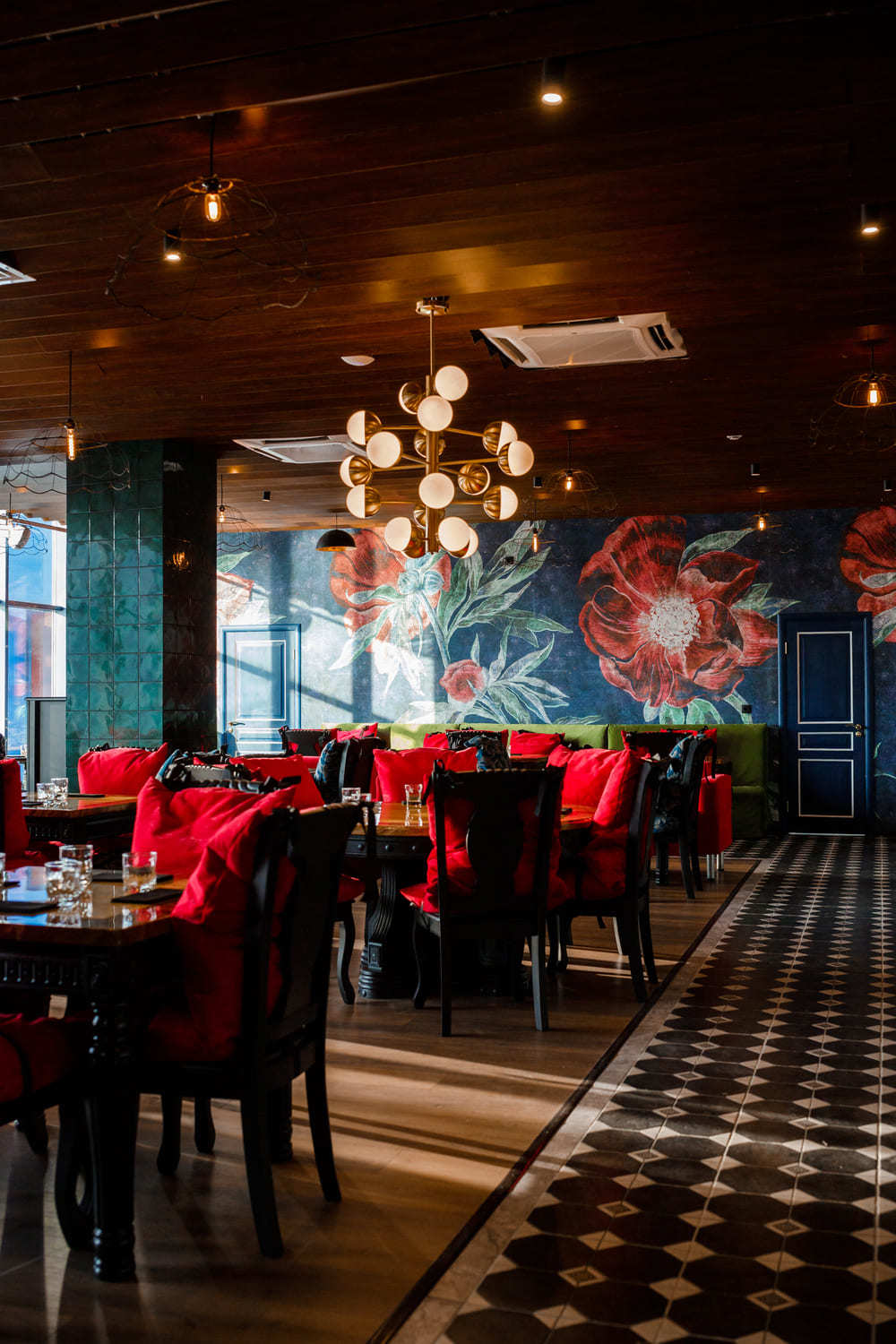 Дизайн интерьера - это то, что поможет вам погрузиться в атмосферу Грузии. Алые ветви пионов обвивают стены с одной стороны, а аутентичное вино, скрупулёзно расставленное по годам на винных стеллажах, выделяет стену с другой стороны. Все вместе создаёт единый яркий и в то же время уютный облик нашего ресторана.